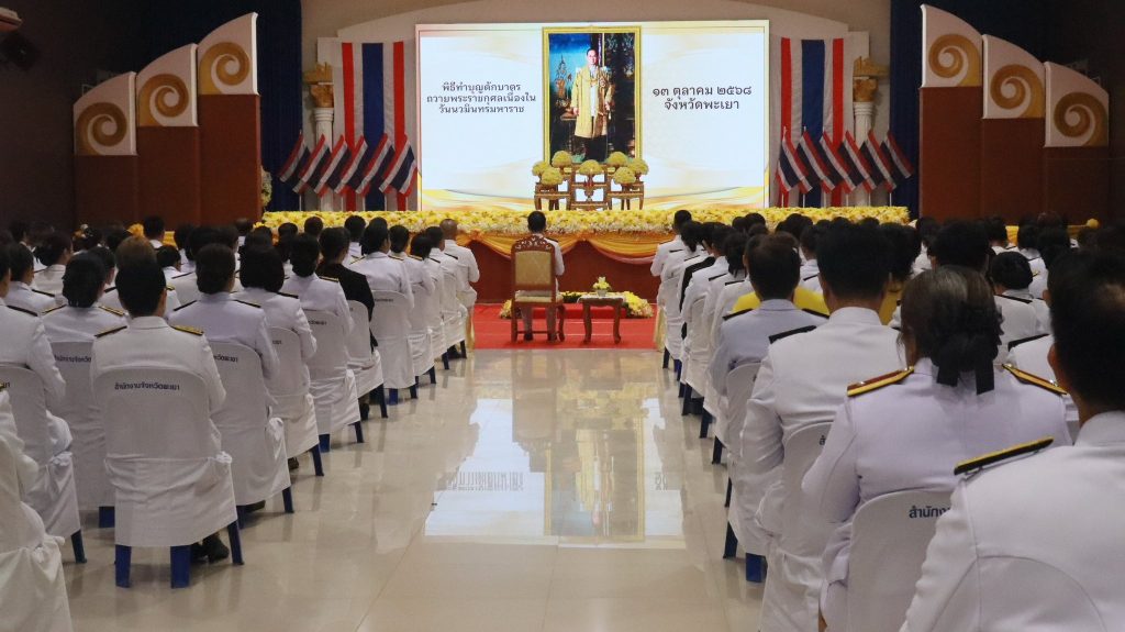 พล.ต.ต.พงษ์สวัสดิ์ ไชยบาล ผบก.ภ.จว.พะเยา, คุณมลธิชา ไชยบาล ประธานแม่บ้านตำรวจภูธรจังหวัดพะเยา, ข้าราชการสถานีตำรวจภูธรเมทองพะเยา และข้าราชการตำรวจในสังกัด ร่วมพิธีทำบุญตักบาตรถวายพระราชกุศลและพิธีวางพวงมาลา เนื่องในวันนวมินทรมหาราช ณ ศาลาประชาคมจังหวัดพะเยา อ.เมืองพะเยา จว.พะเยา โดยมี นายภูธนะ ชมภูมิ่ง รองผู้ว่าราชการจังหวัดพะเยา รักษาราชการแทนผู้ว่าราชการจังหวัดพะเยา เป็นประธานในพิธีฯ