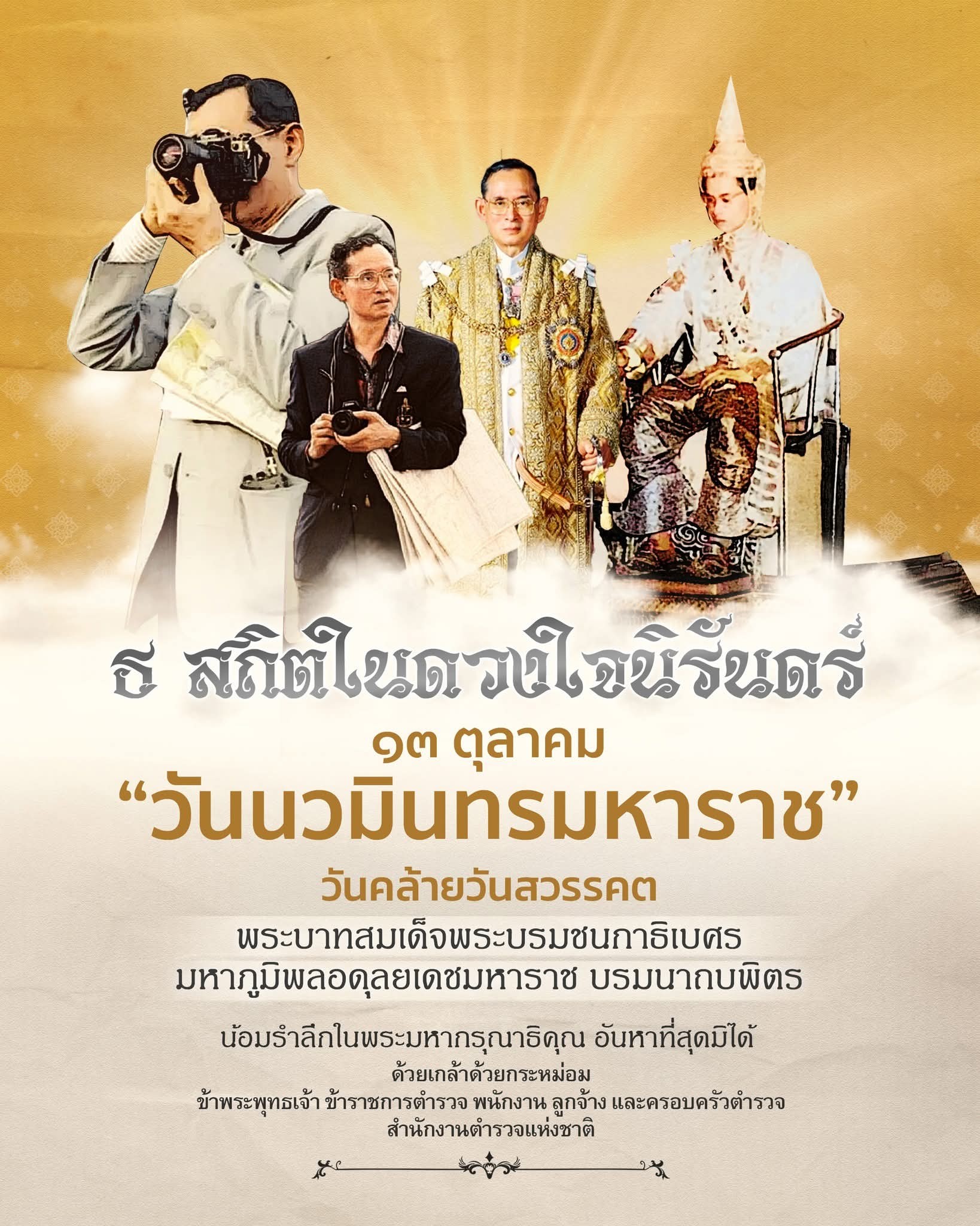 ๑๓ ตุลาคม “วันนวมินทรมหาราช” Estimated read time 1 min read ตุลาคม 13, 2025 ธ สถิตในดวงใจนิรันดร์ ๑๓ ตุลาคม “วันนวมินทรมหาราช” วันคล้ายวันสวรรคต พระบาทสมเด็จพระบรมชนกาธิเบศร มหาภูมิพลอดุลยเดชมหาราช บรมนาถบพิตร น้อมรำลึกในพระมหากรุณาธิคุณ อันหาที่สุดมิได้ ข้าพระพุทธเจ้า ข้าราชการตำรวจ พนักงาน ลูกจ้าง และครอบครัวตำรวจ สำนักงานตำรวจแห่งชาติ #วันนวมินทรมหาราช #สำนักงานตำรวจแห่งชาติ #Royalthaipolice #สถานีตำรวจภูธรเมืองพะเยา
