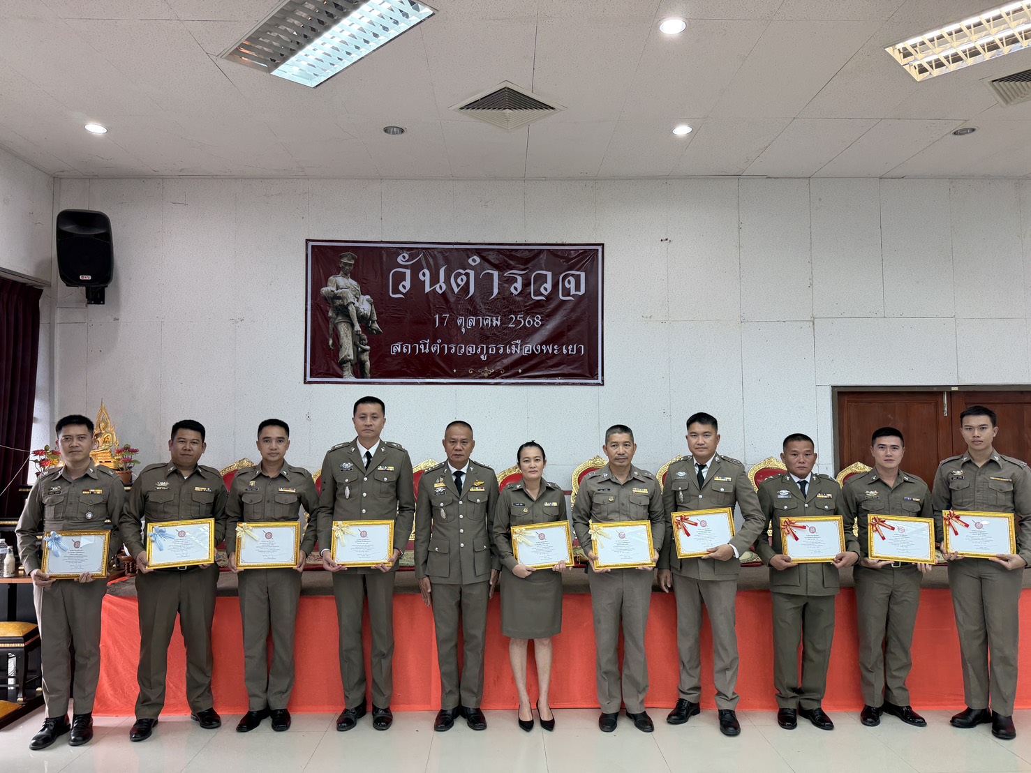 รอง ผกก.สส.ฯ , พ.ต.ท.นิพล จันต๊ะวงค์ รอง ผกก.สอบสวนฯ, นาย ธีระศักดิ์ สิทธิชัยธนะกิจ พร้อมคณะ กต.ตร.ฯ พร้อมด้วยข้าราชการตำรวจ สภ.เมืองพะเยา เข้าร่วมพิธีไหว้สักการะศาลพ่อปู่ ศาลตายาย ,พิธีกล่าวคำสัตย์ปฏิญาณตน ,ทำพิธีทางศาสนา และมอบทุนการศึกษาแก่บุตรธิดาข้าราชการตำรวจ เนื่องในวันตำรวจ 2568 ณ ห้องประชุมชั้น4 สภ.เมืองพะเยา